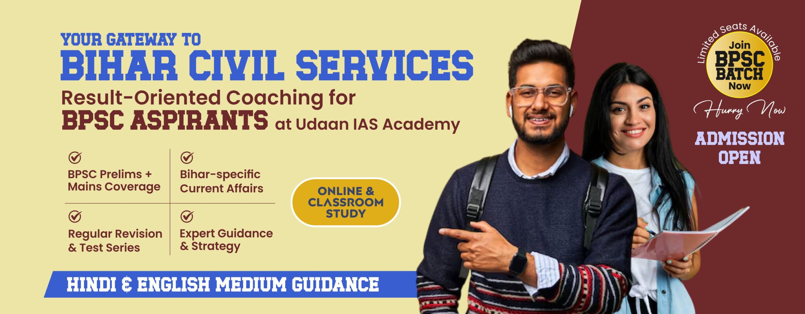 हम यूपीएससी (सिविल सेवा), जेपीएससी (झारखंड लोक सेवा आयोग) और बीपीएससी (बिहार लोक सेवा आयोग) की संपूर्ण तैयारी हेतु कार्यक्रम प्रदान करते हैं। हमारे पाठ्यक्रमों में लाइव कक्षाएं, टेस्ट सीरीज़ और व्यक्तिगत मार्गदर्शन शामिल हैं।